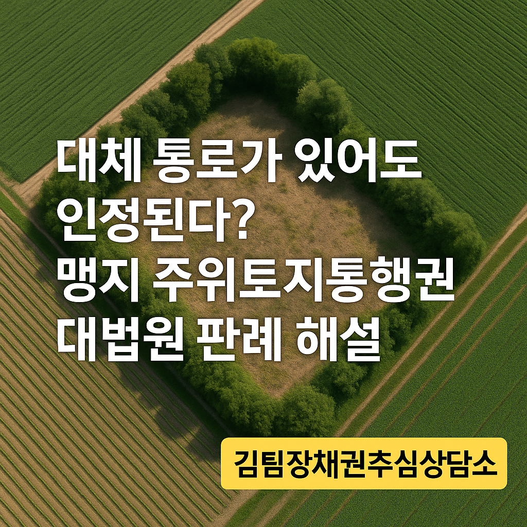 맹지 토지는 겉보기에 ‘막힌 땅’으로 보이지만, 채권자의 강제집행 실무에서는 큰 변수로 작용합니다. 토지가 사방으로 막혀 있으면 경매 가치가 떨어지고, 회수 가능성이 줄어들 수 있기 때문입니다. 그러나 최근 대법원은 중요한 판결을 내렸습니다. 바로 “대체 통로가 있더라도 이용에 부적합하면 주위토지통행권이 인정된다”는 원칙을 다시 한번 명확히 한 것입니다.