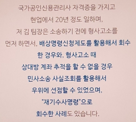 신용관리사가 하는일은 채권자가 의뢰한 개인과 법인채권을 신용조사해서 채권추심(돈받는 행위)을 합니다.