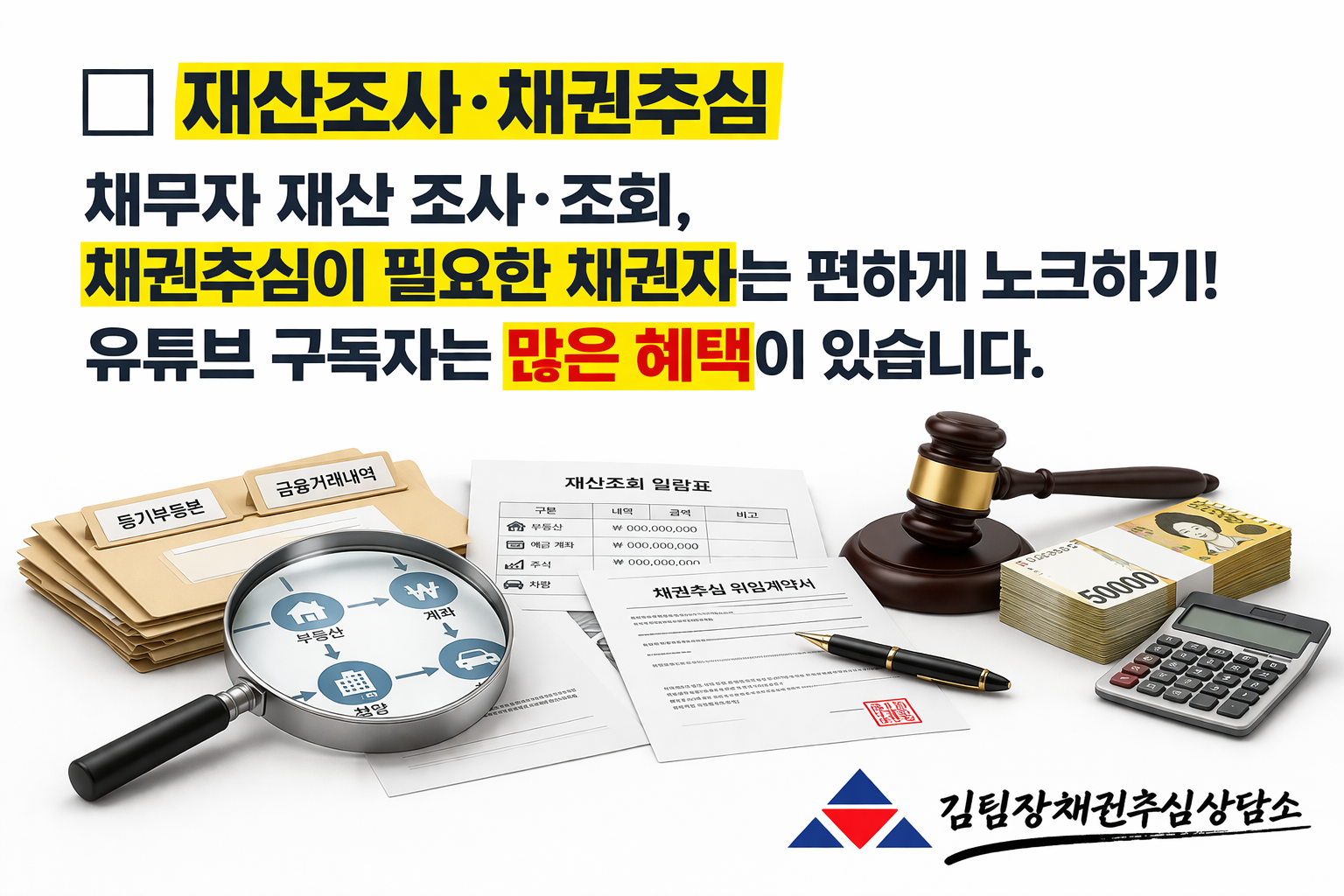채무자 재산 조사·조회, 채권추심이 필요한 채권자는 편하게 노크하기! 유튜브 구독자는 많은 혜택이 있습니다.