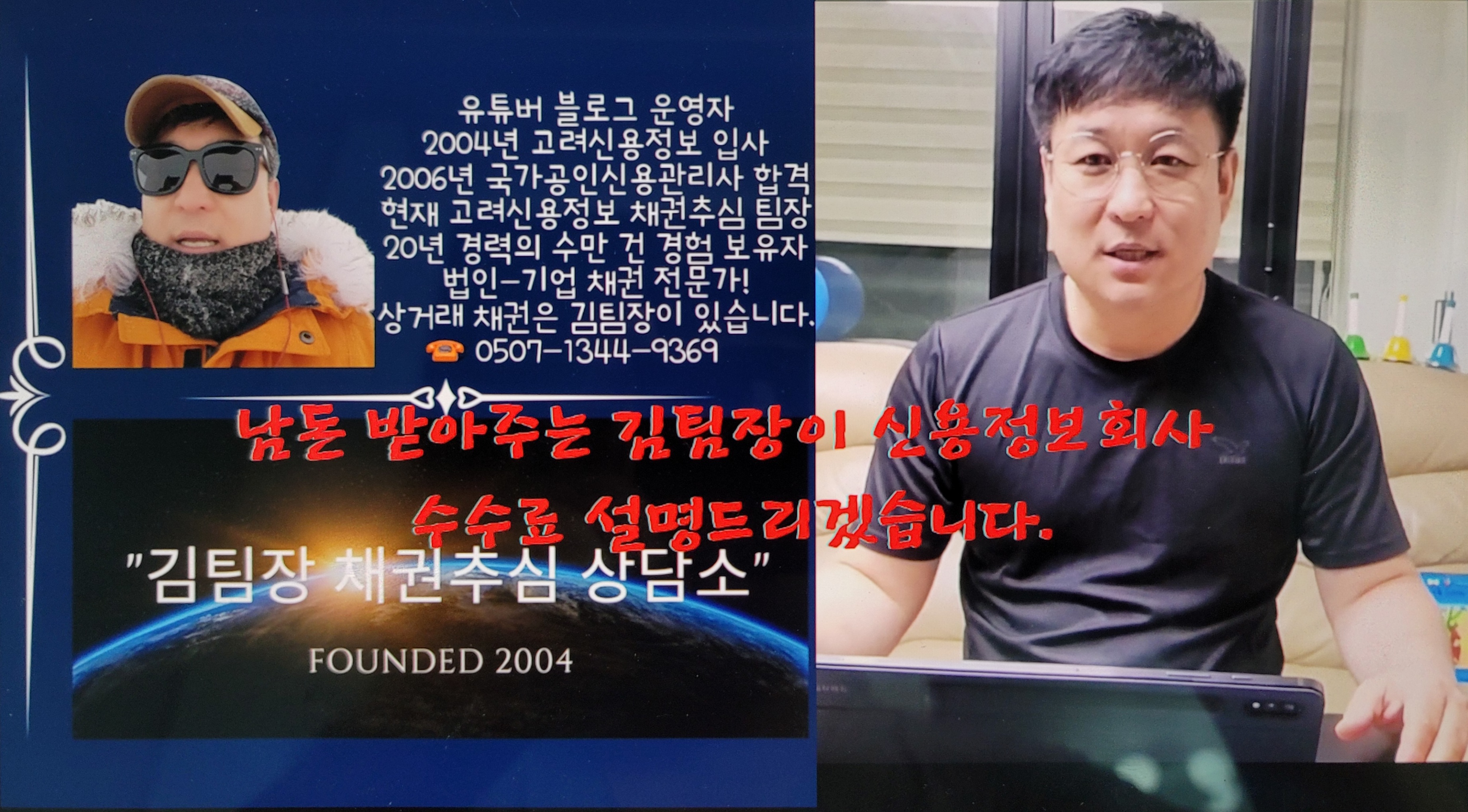 '김팀장 채권추심 상담소' 유튜브와 블로그를 운영하는 국가공인신용관리사, 김팀장입니다. 채권추심에서 가장 중요한 것은 '떼인돈받아드립니다' 입니다. 어떻게하면 가장 효율적으로 회수할지 채권추심 현장에서 20년 가까이 일하며 많은 경험을 했습니다. 제가 유튜브와 블로그를 하는 이유는 좋은 채권자의 선택권과 알 권리를 위해 하고 있습니다. 왜냐하면 최소한의 PR이 없으면 채권자는 추심담당자를 선택할 수 없기 때문입니다.