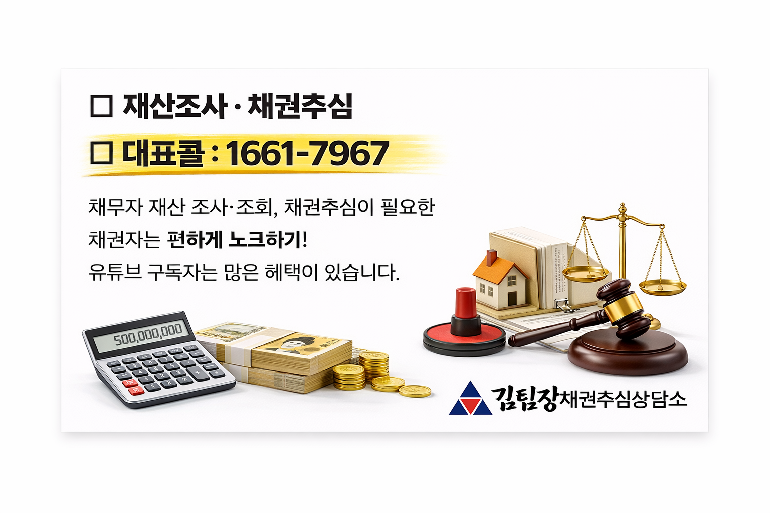 채무자 재산 조사·조회, 채권추심이 필요한 채권자는 편하게 노크하기! 유튜브 구독자는 많은 혜택이 있습니다.