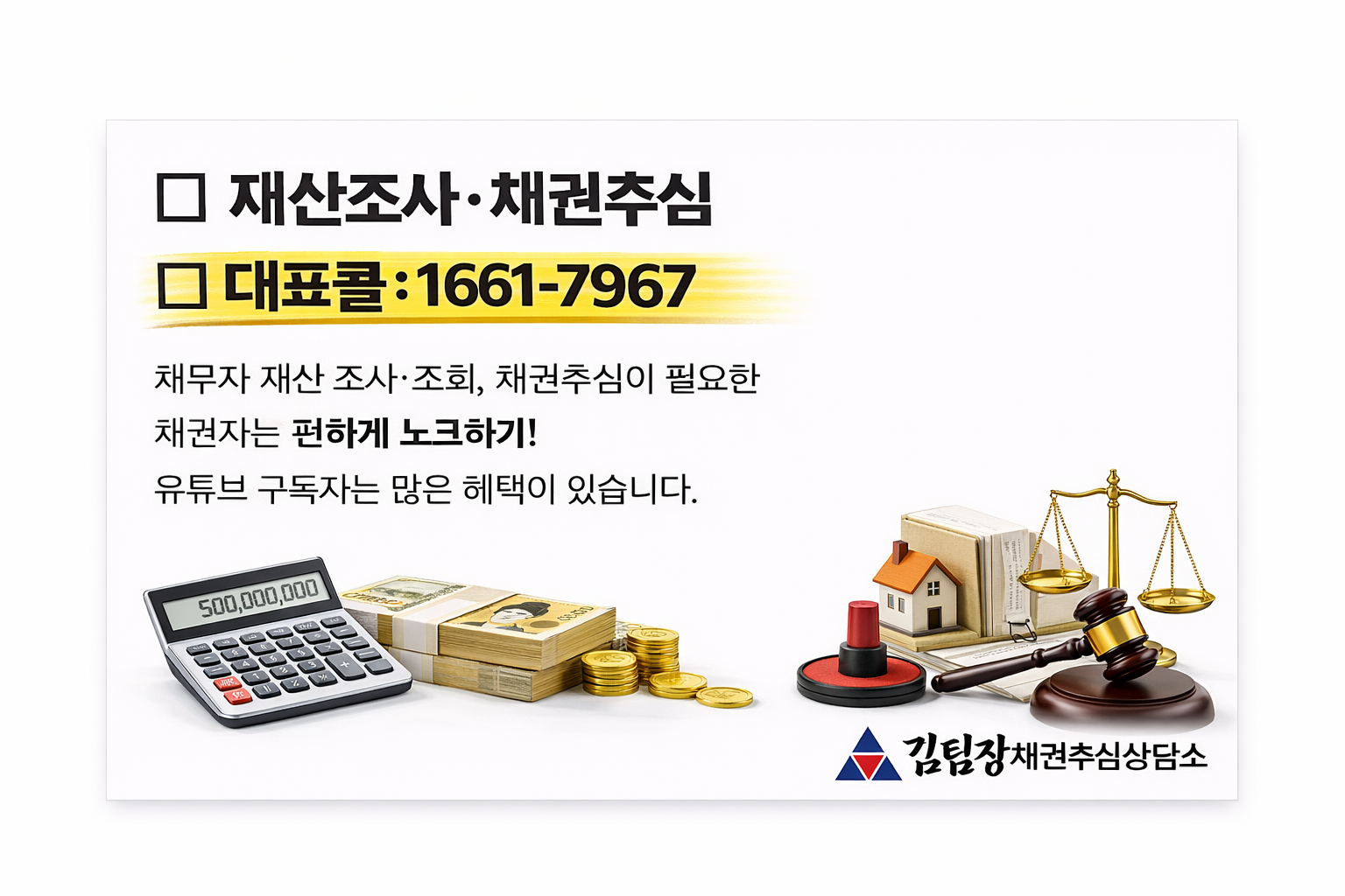 채무자 재산 조사·조회, 채권추심이 필요한 채권자는 편하게 노크하기! 유튜브 구독자는 많은 혜택이 있습니다.