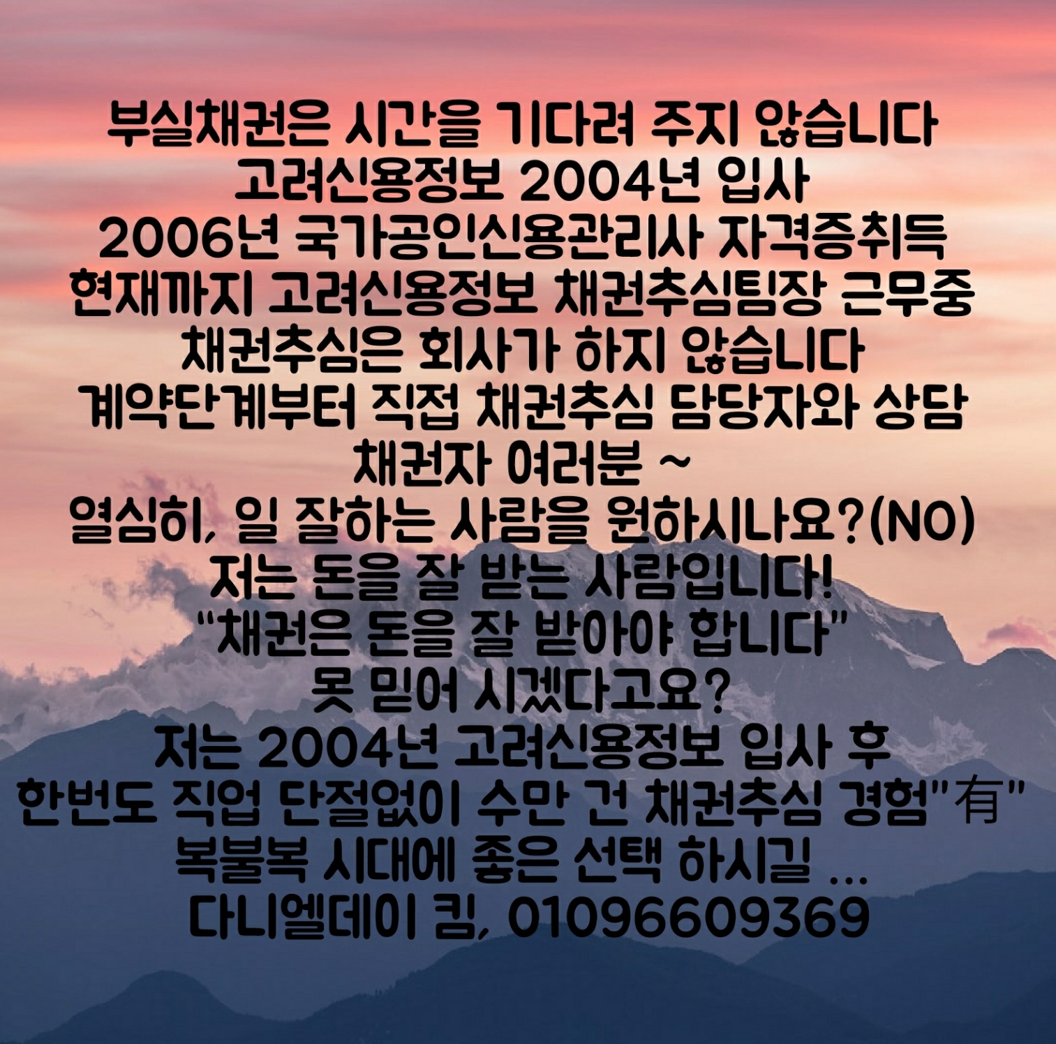 저는 고려신용정보 2004년 입사후 2006년 국가공인신용관리사 자격증을 취득했으며, 고려신용정보 전국 채권추심팀장으로 활동하고 있습니다. 채권채무에 궁금한 사항이 있으면 언제든지 편하게 연락주세요~