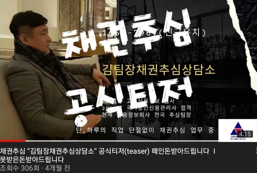 채권추심의 살아있는 전설이 되기 위해 오늘도 노력하고 있는 김팀장입니다. 요즘 무수히 많은 업체와 종사자들이 본인들의 'PR'을 위해서 많은 광고를 하고 있습니다. 그렇다면 채무자에게 돈을 받아오는 모든 행위를 추심 행위라고 하는데 광고를 많이 하는 곳일수록 대금회수율이 높을까요?