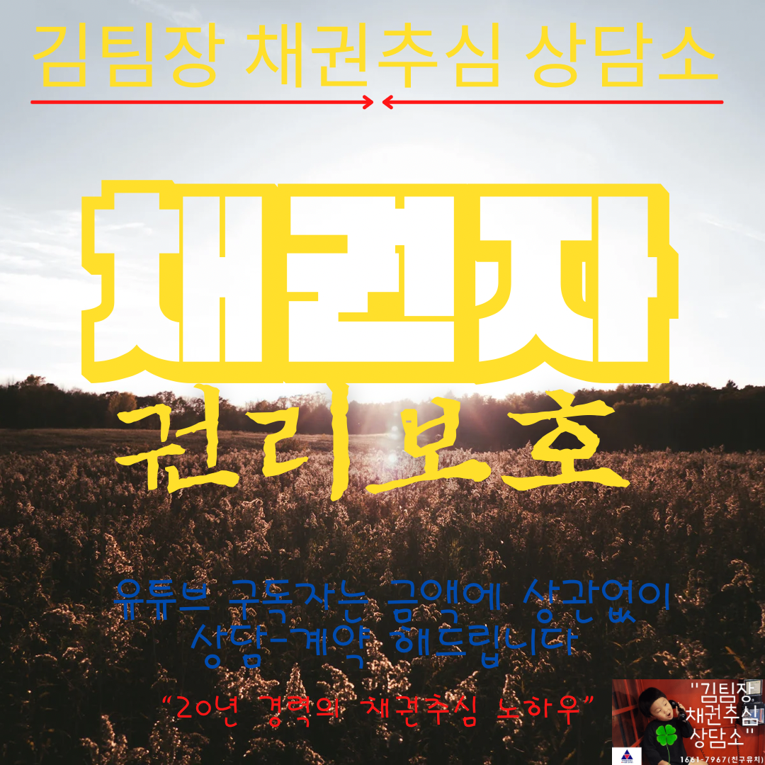 현재 필자는 “김팀장채권추심상담소” 유튜브를 운영하고 있습니다. 많은 채권자들이 대금회수 감사를 댓글로 표현하고 있으며 실제 추심 진행 상황도 영상으로 담았습니다. 채권추심의 살아있는 전설이 되기 위해, 최선보다 최고가 되기 위해, 노력하는 김팀장입니다. 빌려준돈받는법으로 고민하는 채권자에게 한 줄기 빛이 되겠습니다!