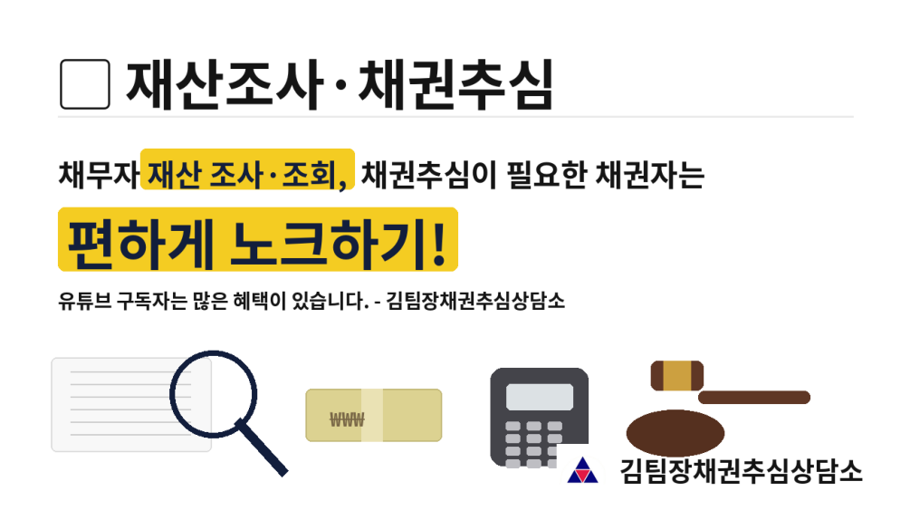 채무자 재산 조사·조회, 채권추심이 필요한 채권자는 편하게 노크하기! 유튜브 구독자는 많은 혜택이 있습니다.