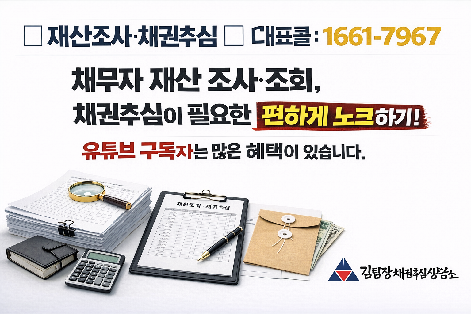 채무자 재산 조사·조회, 채권추심이 필요한 채권자는 편하게 노크하세요! 유튜브 구독자는 많은 혜택이 있습니다.
