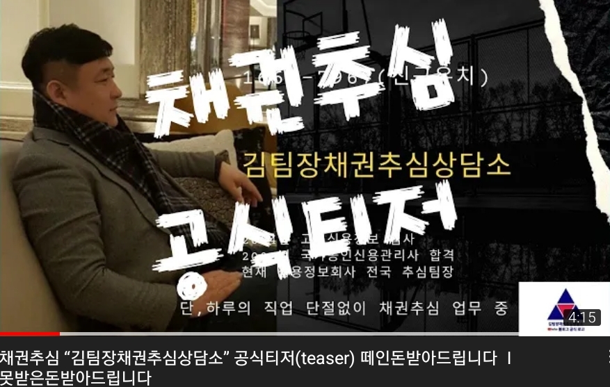 김팀장은 20년 가까이 수천 건 이상의 추심 경험이 있습니다. 김팀장은 신용정보회사에서 영업만 영업 직원이 아니고 직접 채무자 조사도 하고 대금회수도 직접 할 수 있는 추심 팀장입니다. 수많은 채무자를 만나서 경험한 연륜을 이제 좋은 채권자의 대금회수를 위해 도움을 드리려고 합니다. 이 모든 데이터는 선순환 사회를 위해 사용될 것입니다. 김팀장은 현재 “김팀장 채권추심 상담소” 유튜브를 운영하고 있습니다. 제 유튜브 구독자는 상황에 따라, 못받은돈받아드립니다에서 가장 중요한 채무자 조사비 선불을 무료로 하고 있습니다. 그러므로 조사비 선불이 부담스러운 채권자는 김팀장에게 노크할 때, 팀장님~ 구독자입니다라고 말하기 바랍니다.