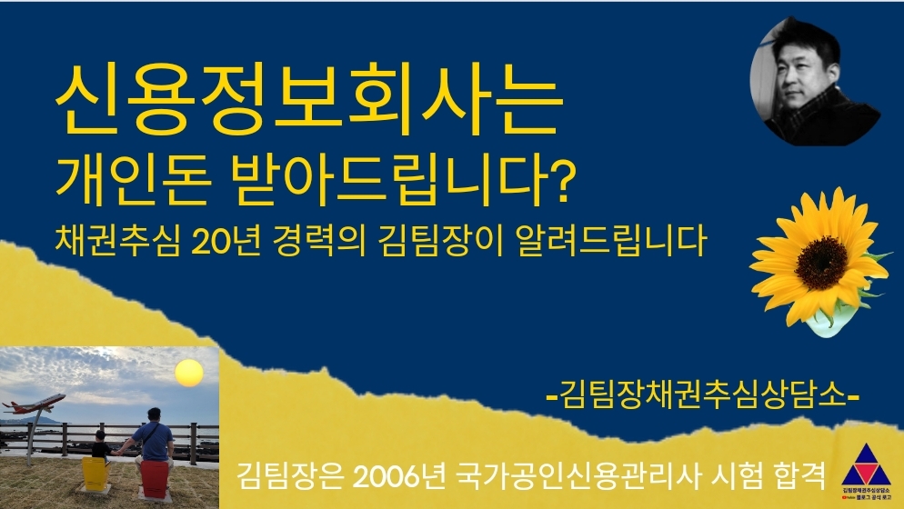 □ 김팀장 약력 : 고려신용정보 채권추심(2004~2022), 2006년 국가공인신용관리사 시험 합격, 현재 “김팀장채권추심상담소” 유튜브 운영자:유튜브 구독자는 채권추심에서 매우 중요한 채무자 조사비 선불을 상황에 따라 무료로 하고 있으며 많은 채권자들이 혜택을 보고 있으며 댓글로 증명하고 있습니다.